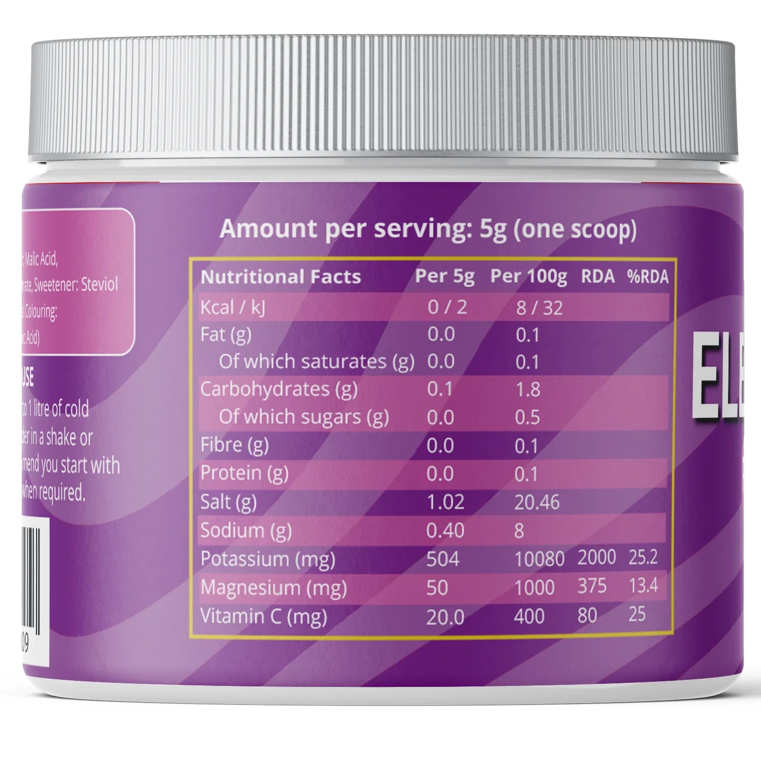 Acidity Regulator: Citric Acid, Magnesium Tri Citrate, Sweetener: Steviol Glycosides of Stevia, Natural Flavouring, Natural Colouring: Grape skin extract, Vitamin C (Ascorbic Acid)