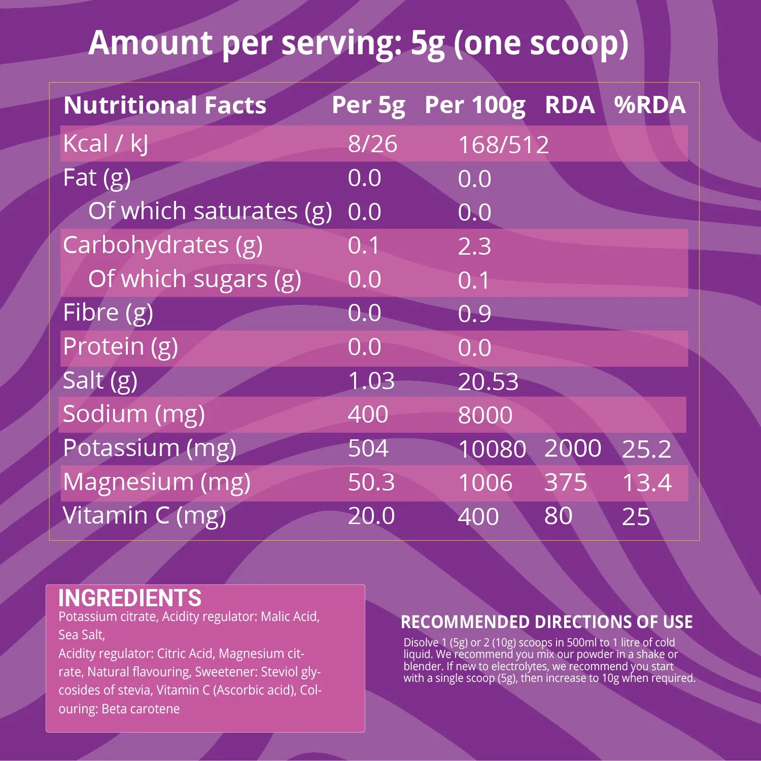 Disolve 1 (5g) or 2 (10g) scoops in 500ml to 1 litre of cold liquid. We recommend you mix our powder in a shake or blender. If new to electrolytes, we recommend you start with a single scoop (5g), then increase to 10g when required.